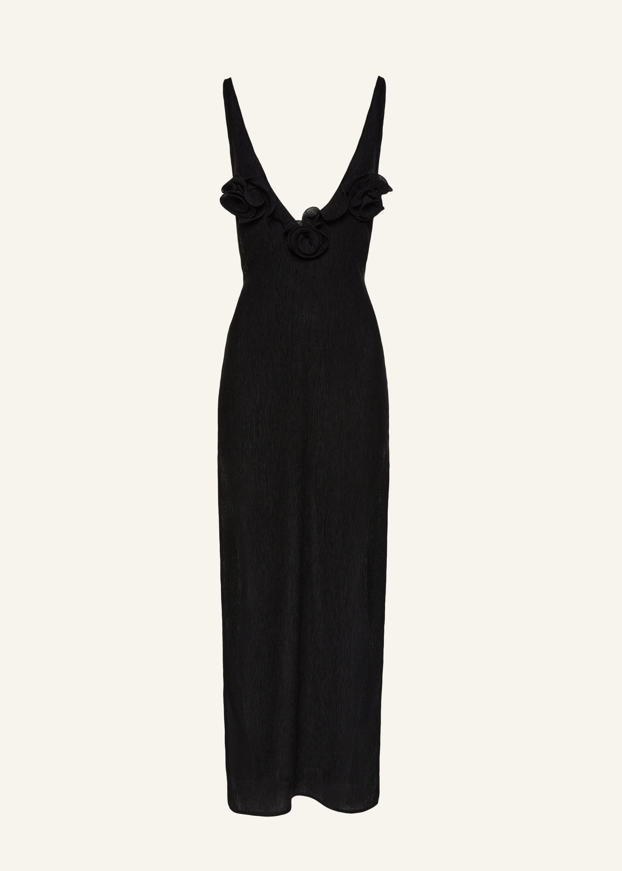 A textured crepe maxi dress featuring a deep v neckline embellished with 3D rose appliques and high side leg slits that button at the waist. Details ID: 194724 SHELL 59% LYOCELL 40% POLYESTER 1% ELASTANE. Sizing This piece fits true to size. We recommend you get your regular size. Model is 179 cm and is wearing a size 34.