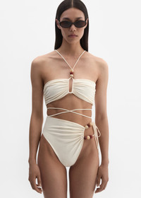 A bandeau style top which joins together in the middle with strings to create a keyhole sort of opening. The beads adorned straps create a criss cross detail at the chest and in back, as well as underneath the bra on the abdomen. Details ID: 622426 Shell 75% Polyamide 25% Elastane Sizing This piece has a regular fit. Model is wearing a size 34.