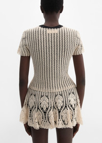 A two-piece set combining a hand-crocheted cotton top with a contrasting viscose jersey underlayer. The crochet layer features short sleeves, a round neckline, and intricate openwork detailing that creates a delicate, lace-like effect. The inner jersey top provides coverage and comfort while allowing the crochet pattern to stand out. The two pieces are designed to be worn together or separately. Details ID: 327426 Shell 100% Cotton Lining 96% Viscose 4% Elastane Sizing This piece has a regular fit. Model is wearing a size 34.