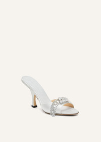 These sculptural mules feature a curved heel and open toe silhouette for a bold, feminine profile. A crystal-encrusted buckle at the strap cascades into strands of rhinestone fringe, adding movement and sparkle with every step. Made in Italy, this glamorous design is a standout accessory for evening wear or statement day looks. Heel height is 10 cm. Details ID: 513925 Upper: Silk 100%. Insole, Sole: Calf Leather 100% Sizing This piece fits true to size. We recommend you get your regular size.