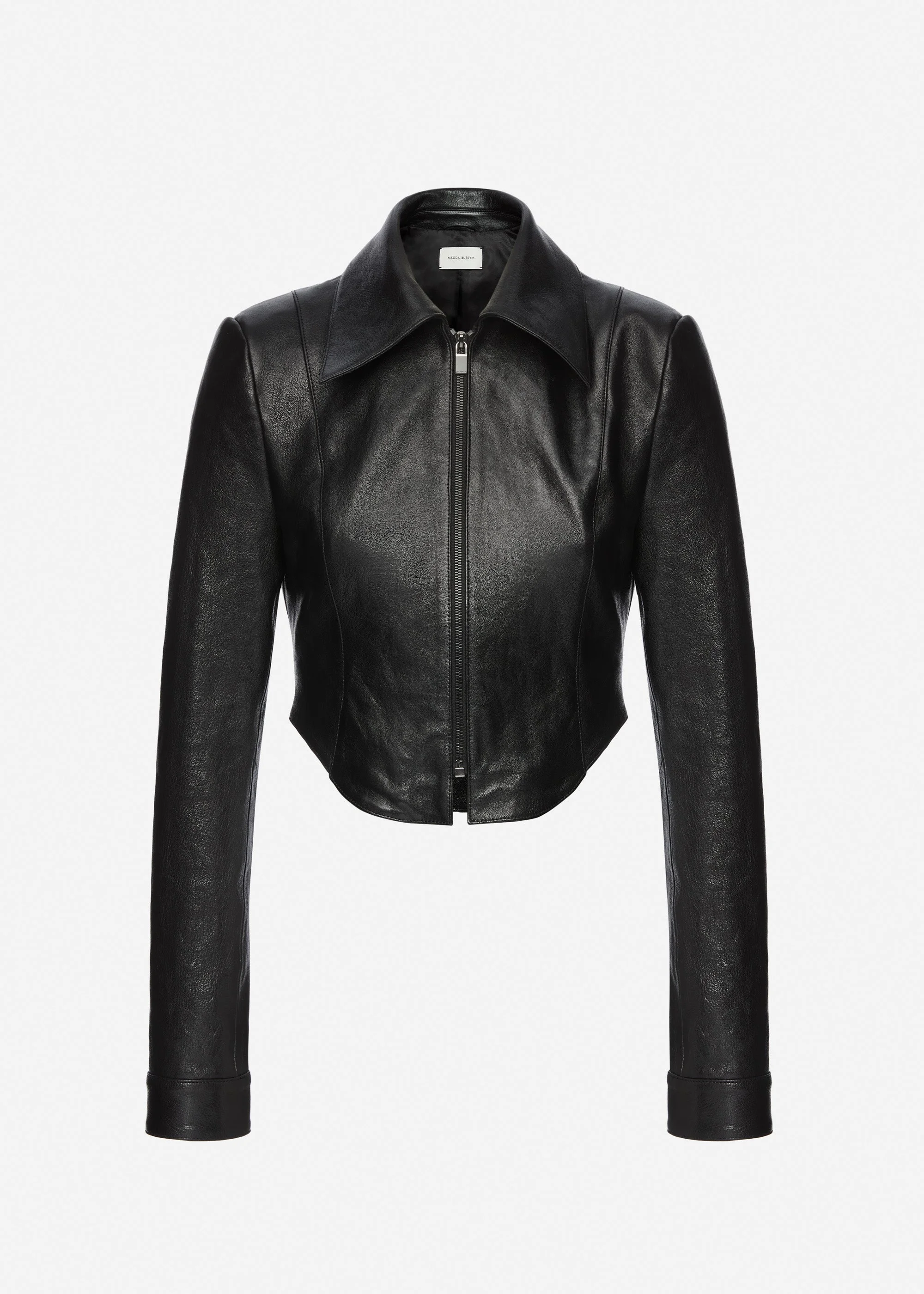 This cropped leather jacket features a sleek zip closure, long sleeves with buttoned cuffs, and precisely tailored seams that contour the body. The pointed collar can be worn flat or pulled up and fastened with a snap closure for added styling versatility. A gently curved hem defines the waist. Details ID: 117426 Shell 100% Sheep Leather Lining 100% Viscose Sizing This piece has a regular fit. Model is wearing a size 34.