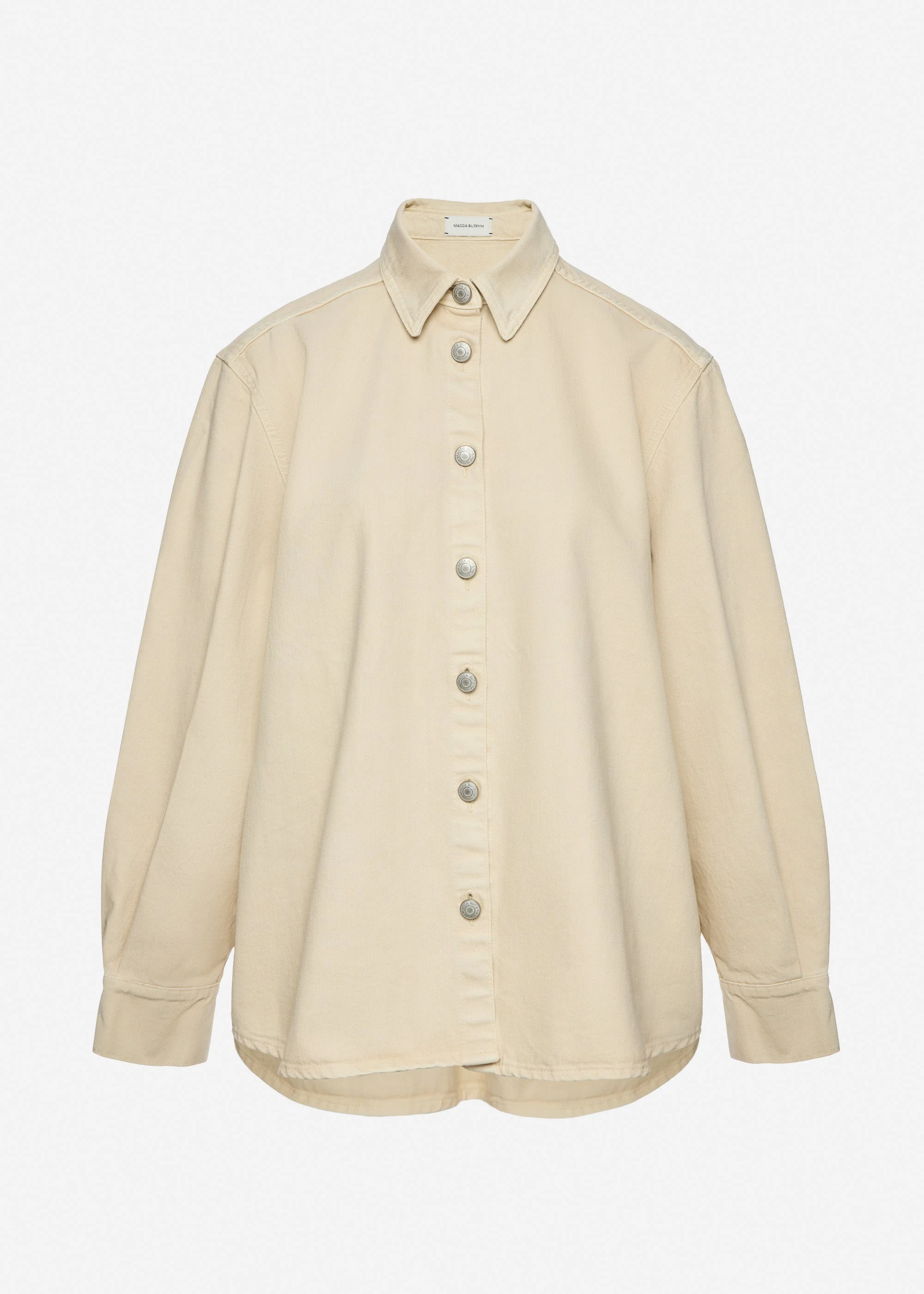 A timeless denim shirt reimagined with an oversized, relaxed silhouette. Designed with a structured collar, button-down front, and voluminous sleeves finished with buttoned cuffs. The back features a gentle pleat for added volume. Details ID: 204426 Shell 100% Cotton. Sizing This piece has a regular fit. Model is wearing a size 34.