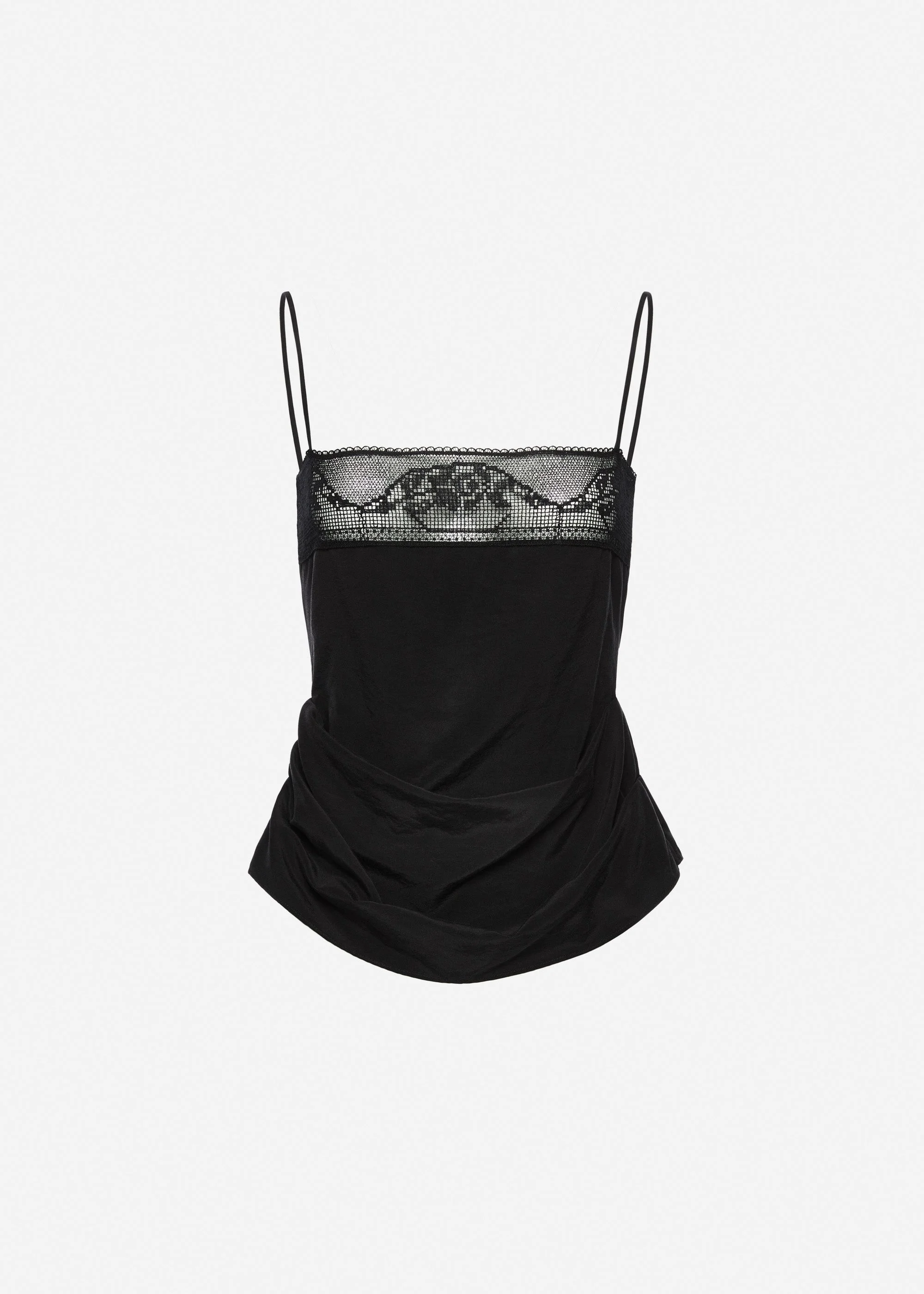 A delicate silk top suspended from fine straps, featuring a straight neckline adorned with sheer floral lace. Draped side folds create a soft, sculptural silhouette that flatters the form. Finished with a concealed zip at the back. Details ID: 220426 Shell 100% Silk. Sizing This piece has a regular fit. Model is wearing a size 34.