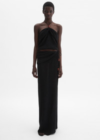 A long, straight skirt crafted from a lightweight, semi-sheer fabric, designed with a full-length slit along the left side. The waist features a soft draped overlay that ties with cords, each finished with decorative stone beads. Details ID: 306426 Shell 59% Lyocell 40% Polyester 1% Elastane Sizing This piece has a regular fit. Model is wearing a size 34.