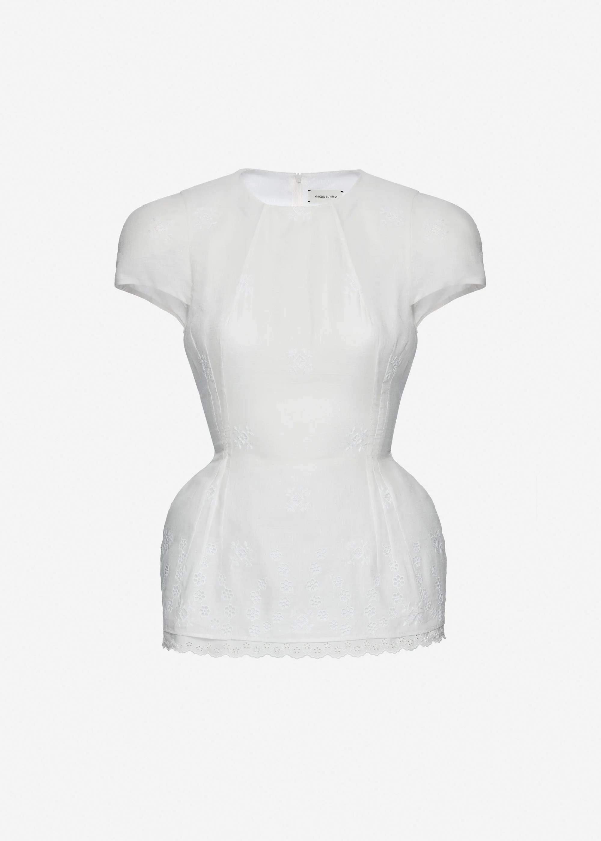 A fitted short-sleeve blouse crafted from a delicate blend of cotton and linen with subtle embroidery throughout. Designed with a round neckline and a defined waist shaped by precise darts. Light shoulder and hip padding create a sculpted silhouette. The piece is fully lined with an additional mesh layer finished in decorative lace, which subtly extends beyond the hem. Closes at the back with a concealed zip. Details ID: 310426 Shell 65% Cotton 30% Linen 5% Polyester Sizing This piece has a slim fit. Model is wearing a size 34.