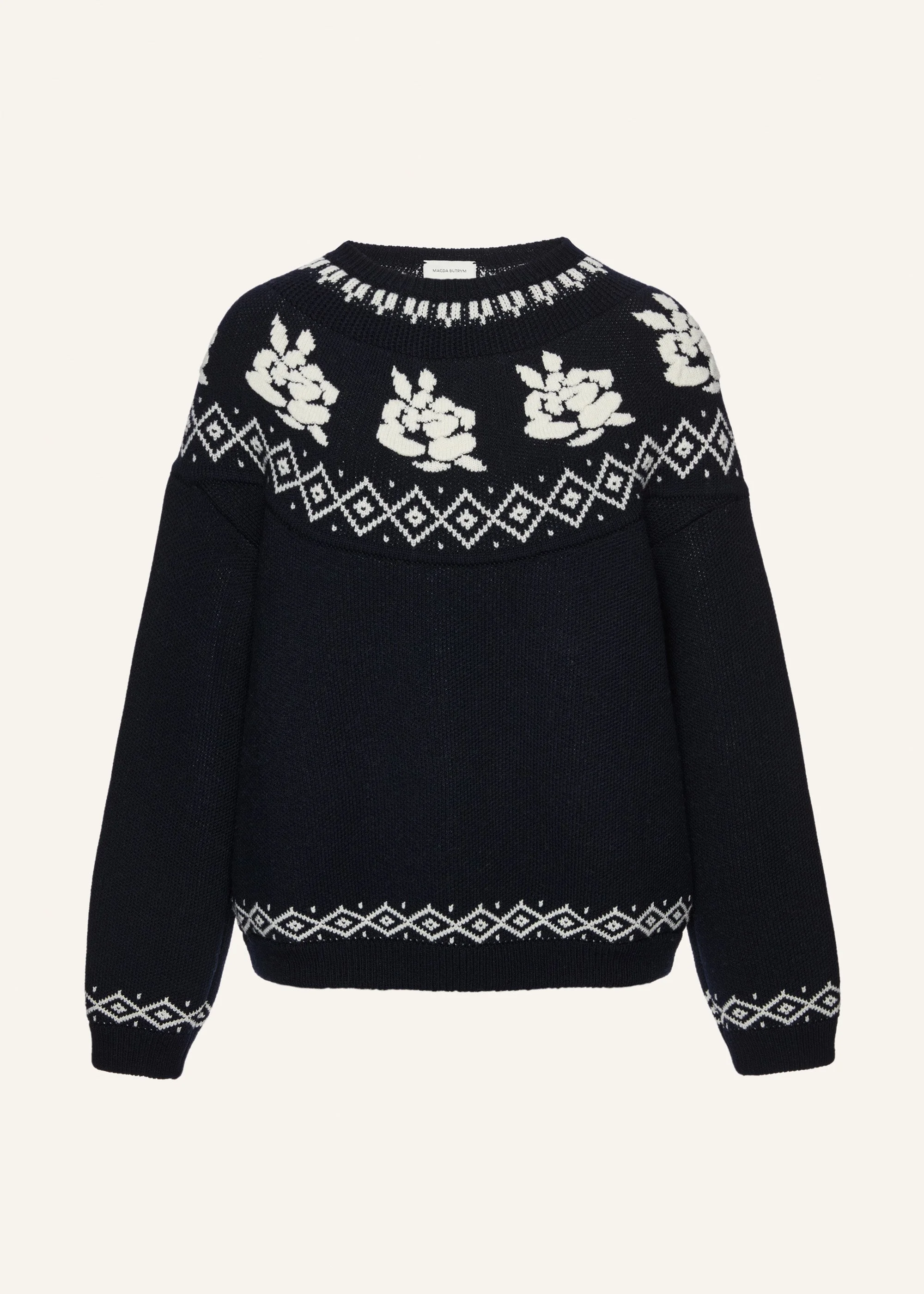 A cozy wool sweater featuring a classic Fair Isle motif reimagined with Magda Butrym's signature touch. The rich navy knit is adorned with cream geometric patterns and a row of bold roses encircling the yoke and shoulders, adding a feminine and romantic element to the traditional design. With a relaxed fit and dropped shoulders, this pullover offers timeless winter style with a distinctly modern edge. Details ID: 294925 Shell 100% Wool. Sizing This piece fits true to size. We recommend you get your regular size. Model is 177 cm and is wearing a size 34.