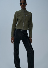 A classic biker jacket fit with a zip up front and fit that hits close to the body, with a snap neck closure. Details ID: 114725 Shell 100% Sheep Leather. Lining 100% Viscose. Sizing This piece fits true to size. We recommend you get your regular size. Model is 180 cm and is wearing a size 34.