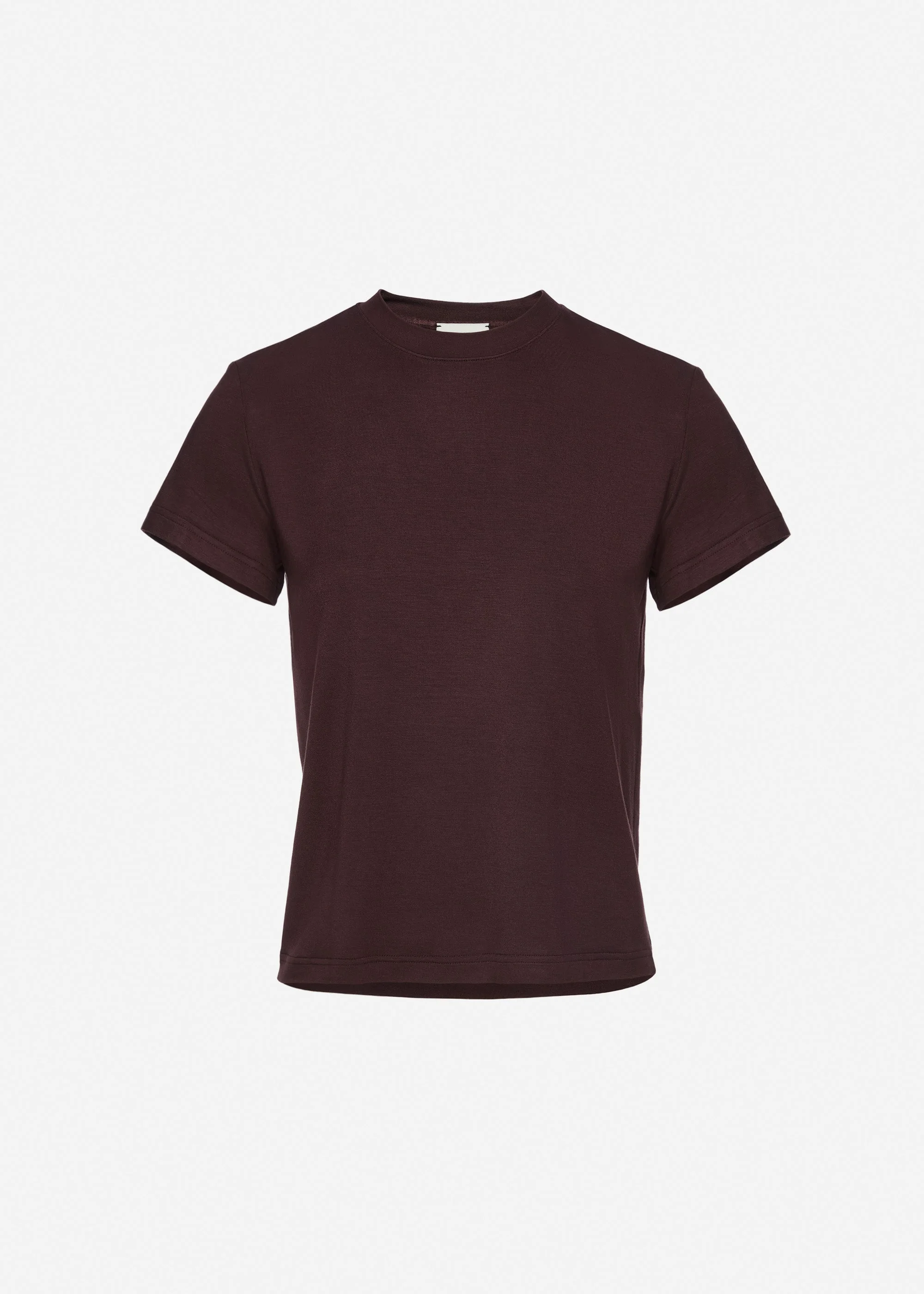 A short, fitted T-shirt crafted from soft, sustainable Circulose® jersey with a touch of elastane for stretch and comfort. Features a wide crew neckline and a subtle embroidered flower logo detail at the back, just below the collar. A timeless everyday essential with a refined finish. Details ID: 192426 Shell 95% Cupro 5% Elastane. Sizing This piece has a regular fit.