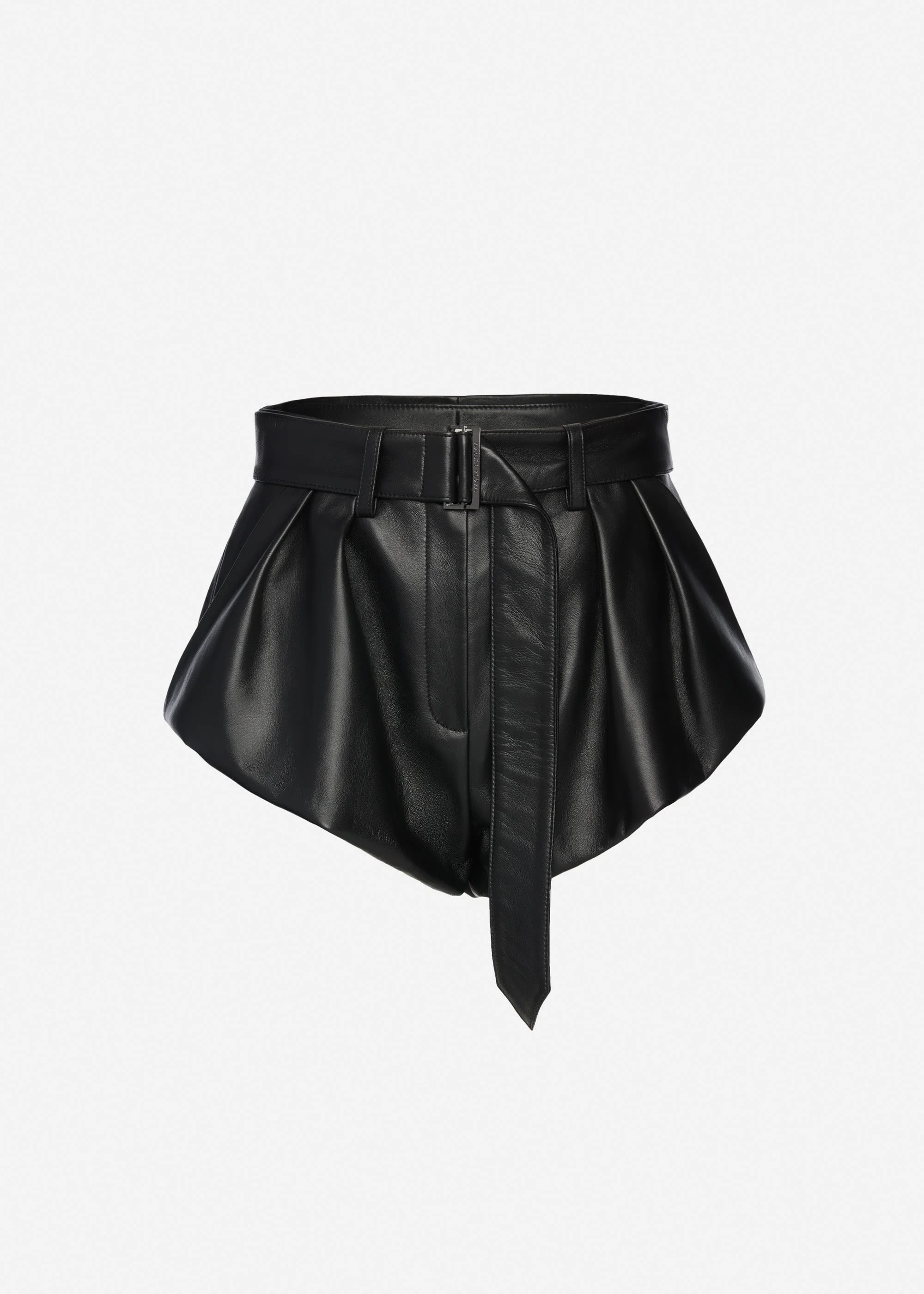 High-waisted leather shorts designed with pleats at the front for volume. Featuring side and back pockets and a wide matching belt with a metal buckle that cinches the waist. Details ID: 128426 Shell 100% Sheep Leather Lining 100% Viscose Sizing This piece has a regular fit. Model is wearing a size 34.