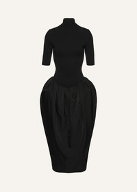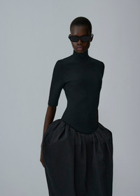 A form-fitting midi dress that combines a structured silhouette with dramatic volume. It features a sleek turtleneck and fitted 3/4 sleeves, contrasted by a voluminous skirt with a high slit at the back. The bodysuit base fastens underneath the skirt. Details ID: 180925 Shell [1] 92% Cupro 8% Elastane [2] 51% Cotton 49% Silk Sizing This piece fits true to size. We recommend you get your regular size. Model is 177 cm and is wearing a size 34.