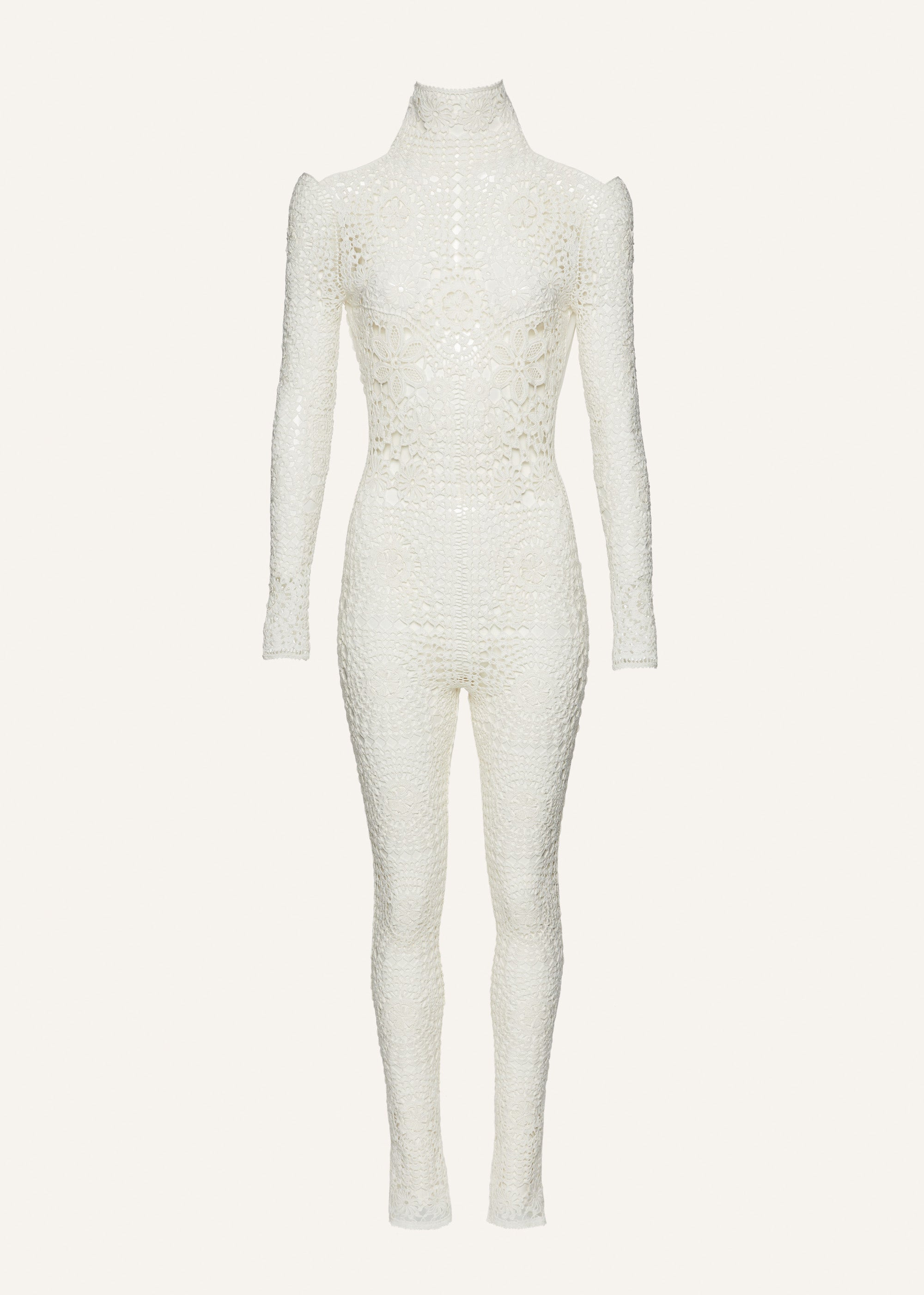 A one of a kind and completely handmade piece, this lace jumpsuit is a true display of Polish craftsmanship. Made from a special lace embroidery technique originating from the city of Koniakow, Poland, this piece exemplifies a centuries-old tradition of lace craftsmanship. Magda worked closely with the Koniakow Lace Foundation, aimed at preserving the craft, to create this high neck, full body catsuit in all over lace. If you seek any advice regarding this item, our Client Advisors are available to provide personalised assistance. Feel free to contact us at customercare@magdabutrym.com. Details ID: 267724 SHELL 100% COTTON. Sizing This piece fits true to size. We recommend you get your regular size. Model is 180 cm and is wearing a size 34.