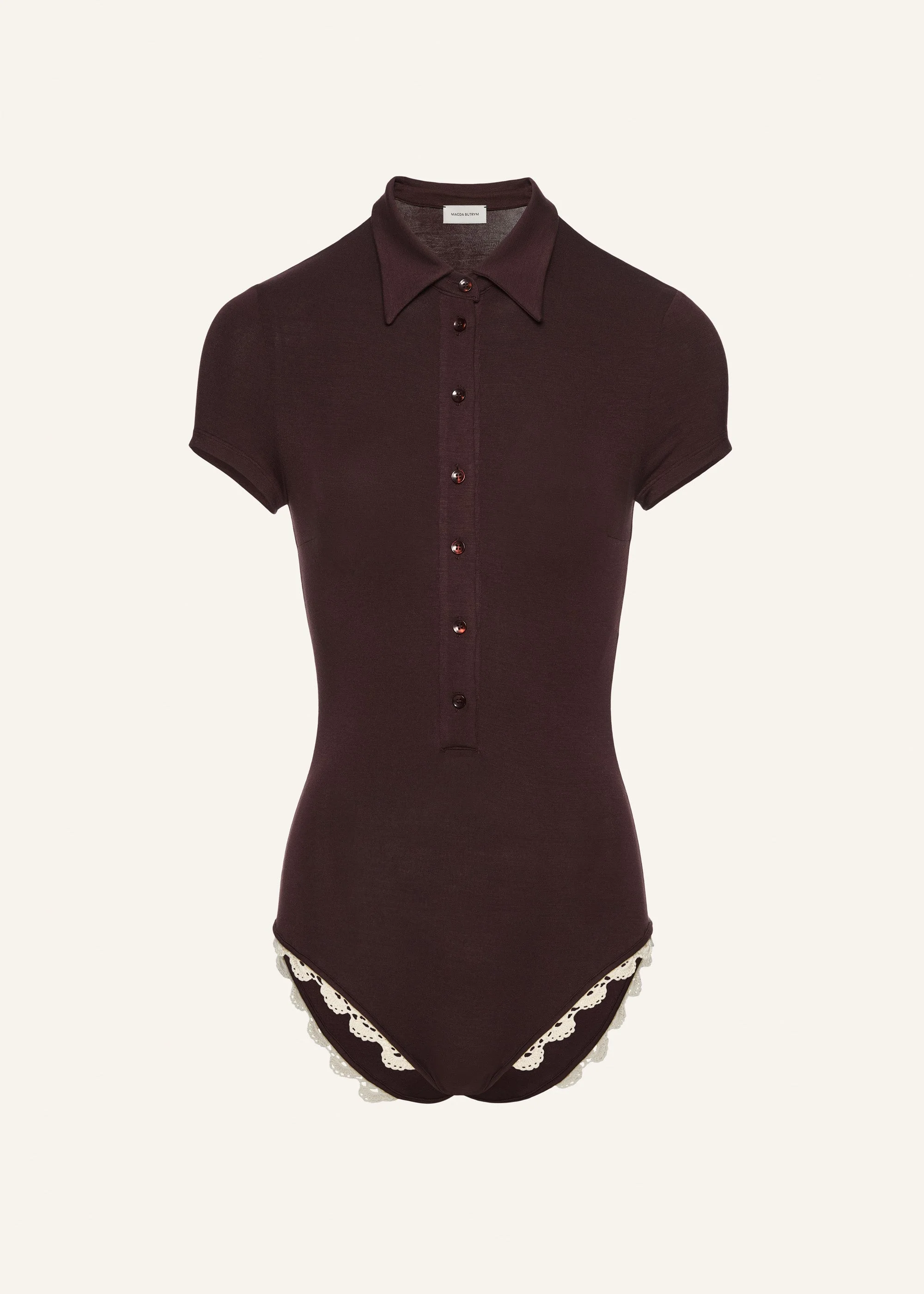 A short sleeve bodysuit with a buttoned polo collar and lace trim detailing, adding a special touch of Magda's handmade crochet to this classic piece. Details ID: 195925 Shell 95% Circulose 5% Elastane Sizing This piece fits true to size. We recommend you get your regular size. Model is 177 cm and is wearing a size 34.