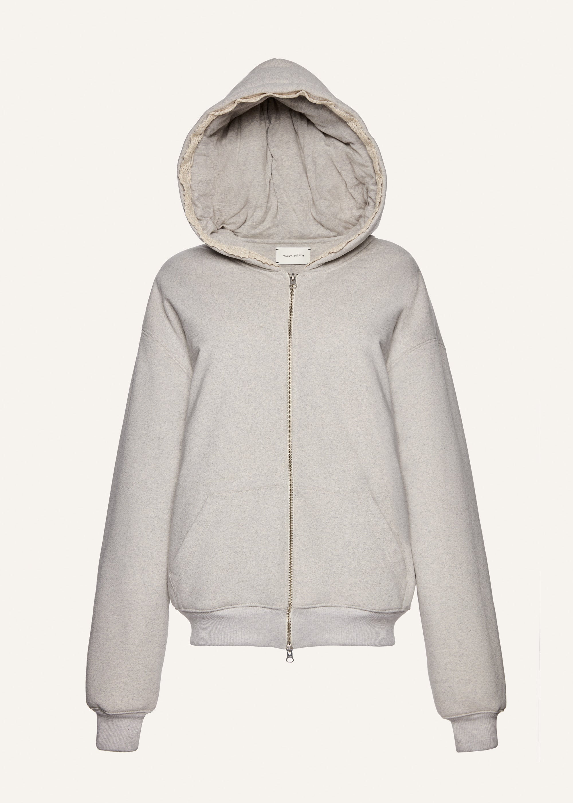 a thick padded hoodie that can be worn as loungewear or as a jacket, this zip up is trimmed with Magda Butrym's signature handmade lace crochet trim. Details ID: 238725 Shell [1] 50% Cotton 50% Recycled Cotton [2] 97% Cotton 3% Elastane Sizing This piece fits true to size. We recommend you get your regular size. Model is 180 cm and is wearing a size 34.