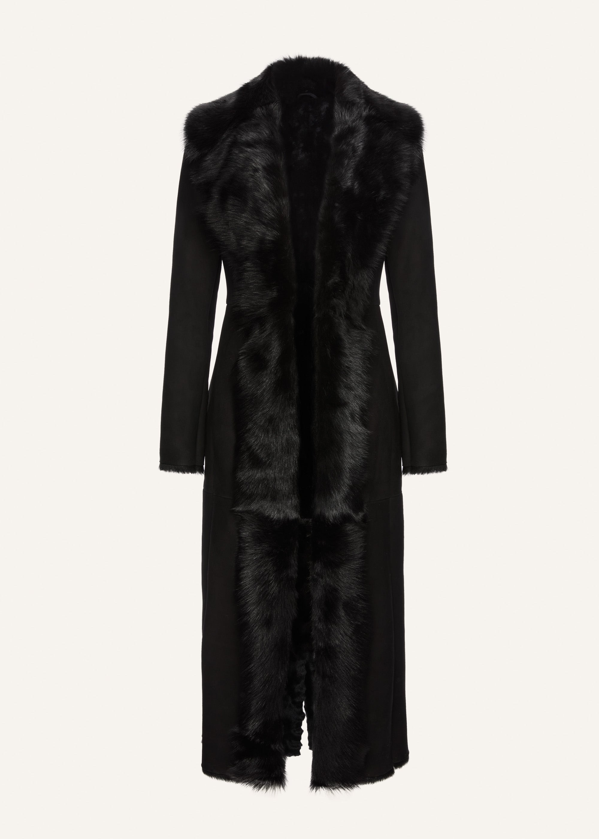 Long tailored coat in supple black shearling leather, featuring plush fur trim along the collar and front opening. Details ID: 171925 Shell 100% Sheep Leather. Sizing This piece fits true to size. We recommend you get your regular size. Model is 177 cm and is wearing a size 34.