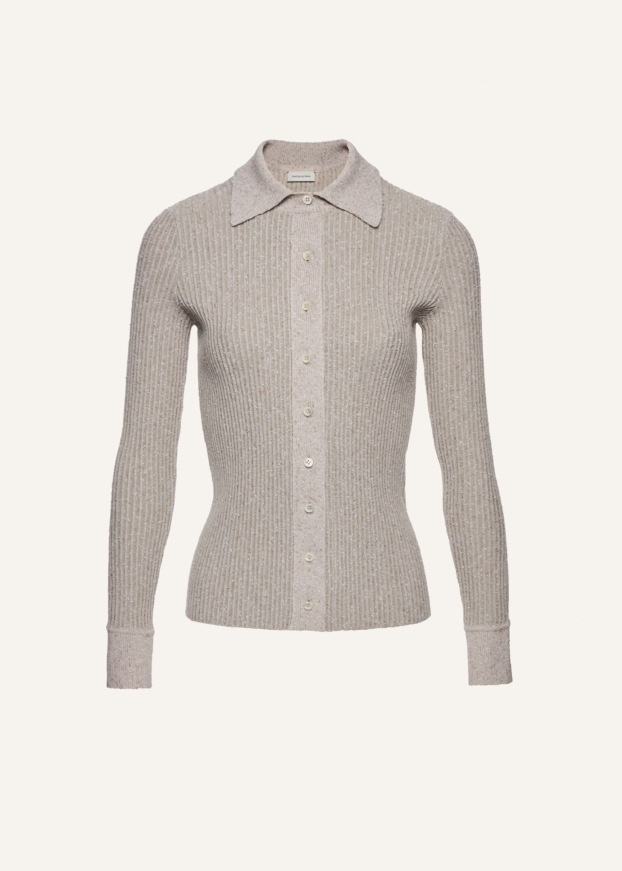 A marled button down knitwear top with a simple collar that can be worn closed, or open and layered as a cardigan. Details ID: 321725 Shell 67% Viscose 33% Polyamide. Sizing This piece fits true to size. We recommend you get your regular size. Model is 180 cm and is wearing a size 34.