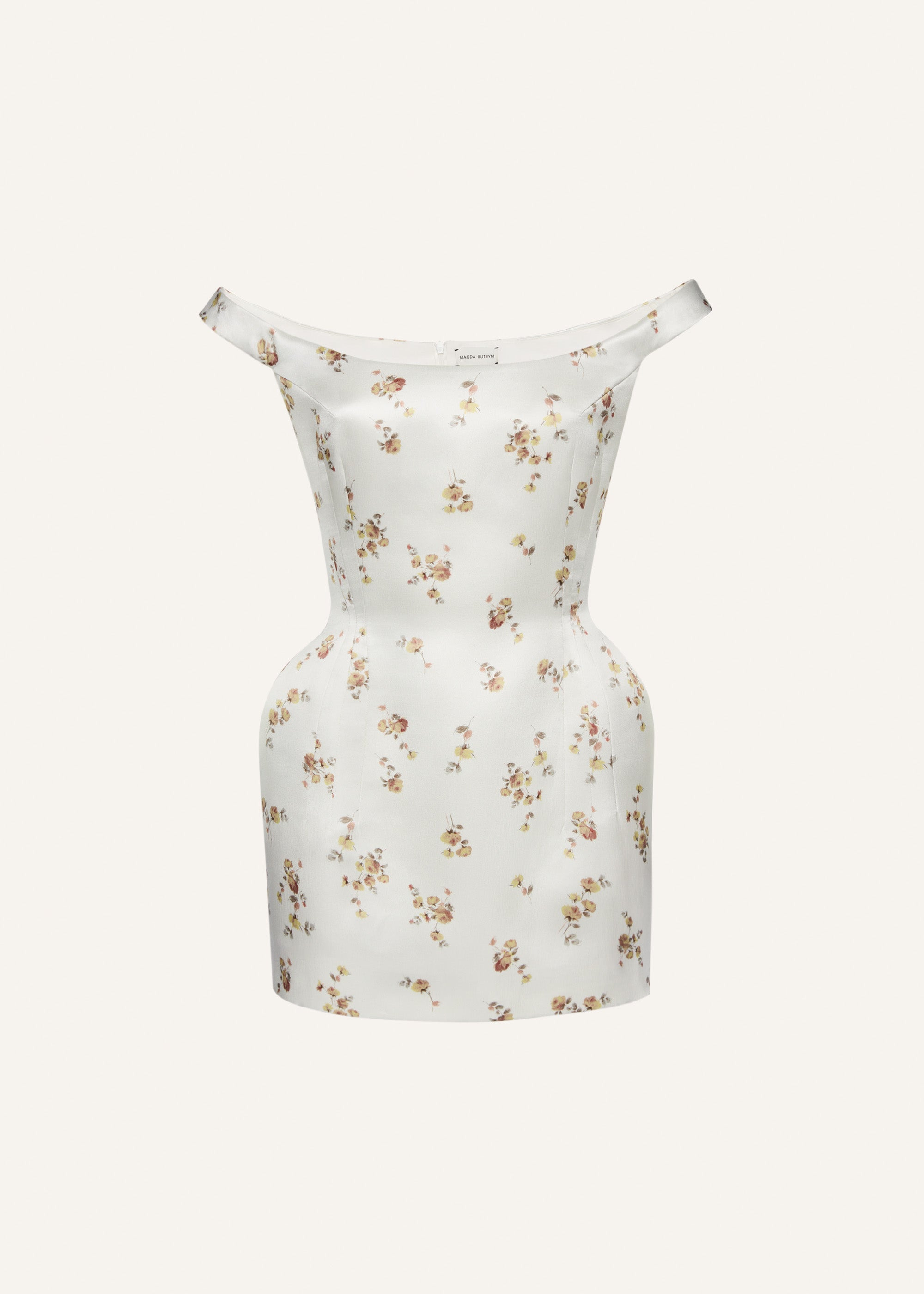 This ladylike midi dress is made from lightweight silk and creates an hourglass shape by using hip pads and a fitted bodice, complemented by a rounded off-shoulder neckline. Details ID: 201725 Shell 100% Silk. Lining 100% Silk. Sizing This piece fits true to size. We recommend you get your regular size. Model is 180 cm and is wearing a size 34.