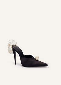 Made in Italy, these pointed toe mules are set atop a 110mm heel and feature Magda's signature 3D flower at the heel. As an extra detail, a large faux pearl adorns the front. Details ID: 531723 Upper: 72% Viscose 28% Silk. Insole. Sole: 100% Calf Leather. Flower 100% Silk. Sizing This piece fits true to size. We recommend you get your regular size.
