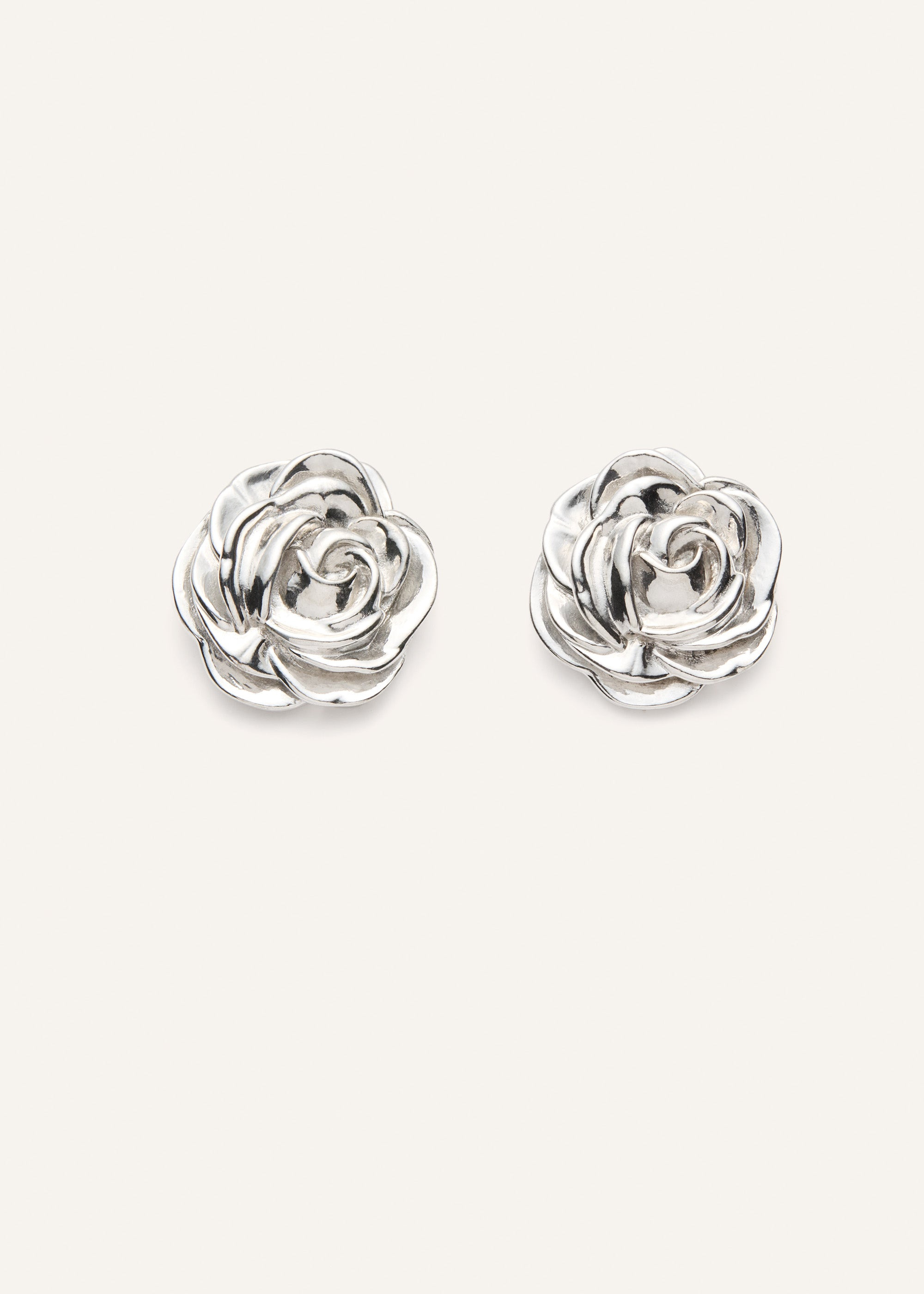 This season interpretation of our flower emblem, created through unique 3D flowers is put into the spotlight with chrome silver. For pierced ears Details ID: 701725 Hypoallergenic Plated Brass. Sizing Approximate measurements: flower diameter is 3 cm