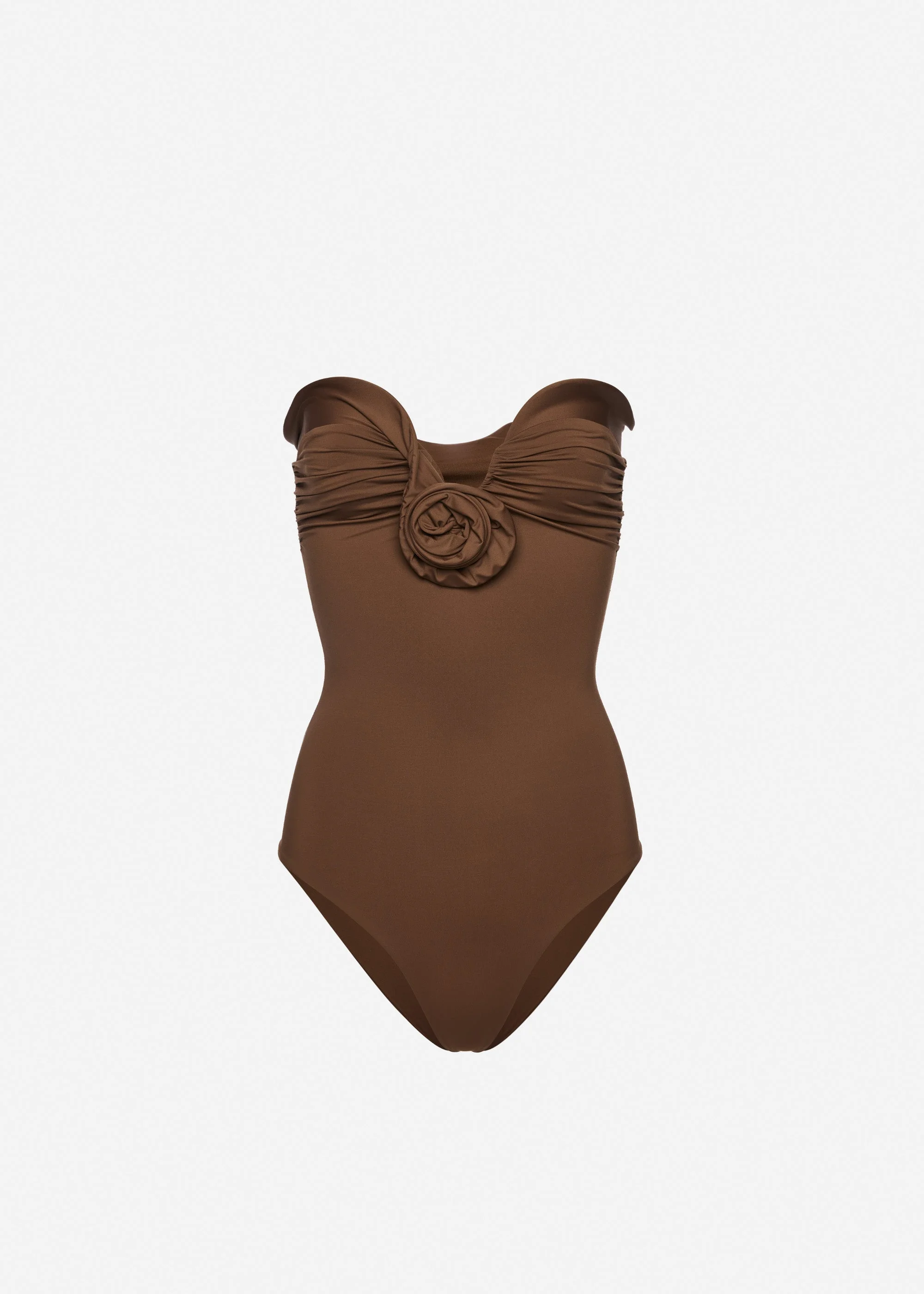 Embrace pool-side elegance with this rose bustier swimsuit. Featuring a sweetheart neckline with ruffle accents and a signature rosette at the center, this piece combines refined structure and femininity. The contoured silhouette creates a flattering fit, making it a standout addition to any swimwear collection. Details ID: 608426 Shell 80% Polyamide 20% Elastane Sizing This piece has a regular fit. Model is wearing a size 34.