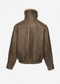A classic brown shearling aviator jacket crafted from soft textured leather with a warm shearling lining. Features an oversized collar that can be worn open or fastened high with a buckle strap. Detailed with vertical leather paneling, side zippers on the cuffs, and an adjustable belt at the hem. Details ID: 109426 Shell 100% Sheep Leather Lining 100% Viscose Sizing This piece has a regular fit. Model is wearing size 36.