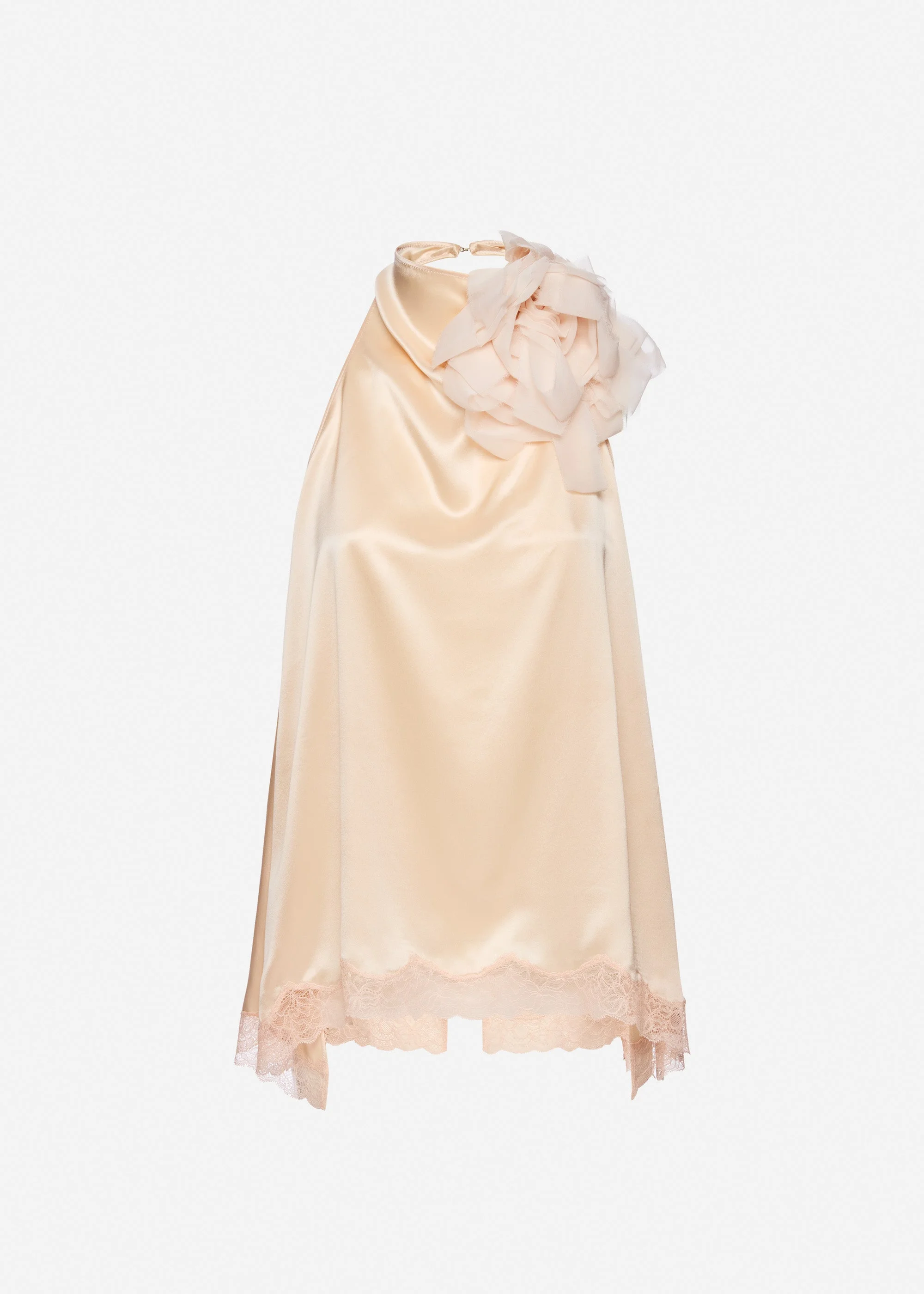 A fluid silk blouse with a high neckline that fastens at the back with a delicate hook. The open back is tied with long flowing sashes for an elegant draped effect. Finished with side slits and a scalloped lace trim along the hem. Comes with a detachable flower brooch for optional embellishment. Details ID: 348426 Shell 100% Silk Sizing This piece has a regular fit. Model is wearing a size 34.