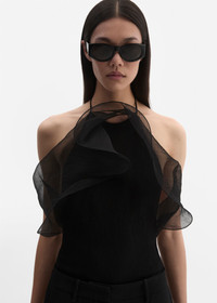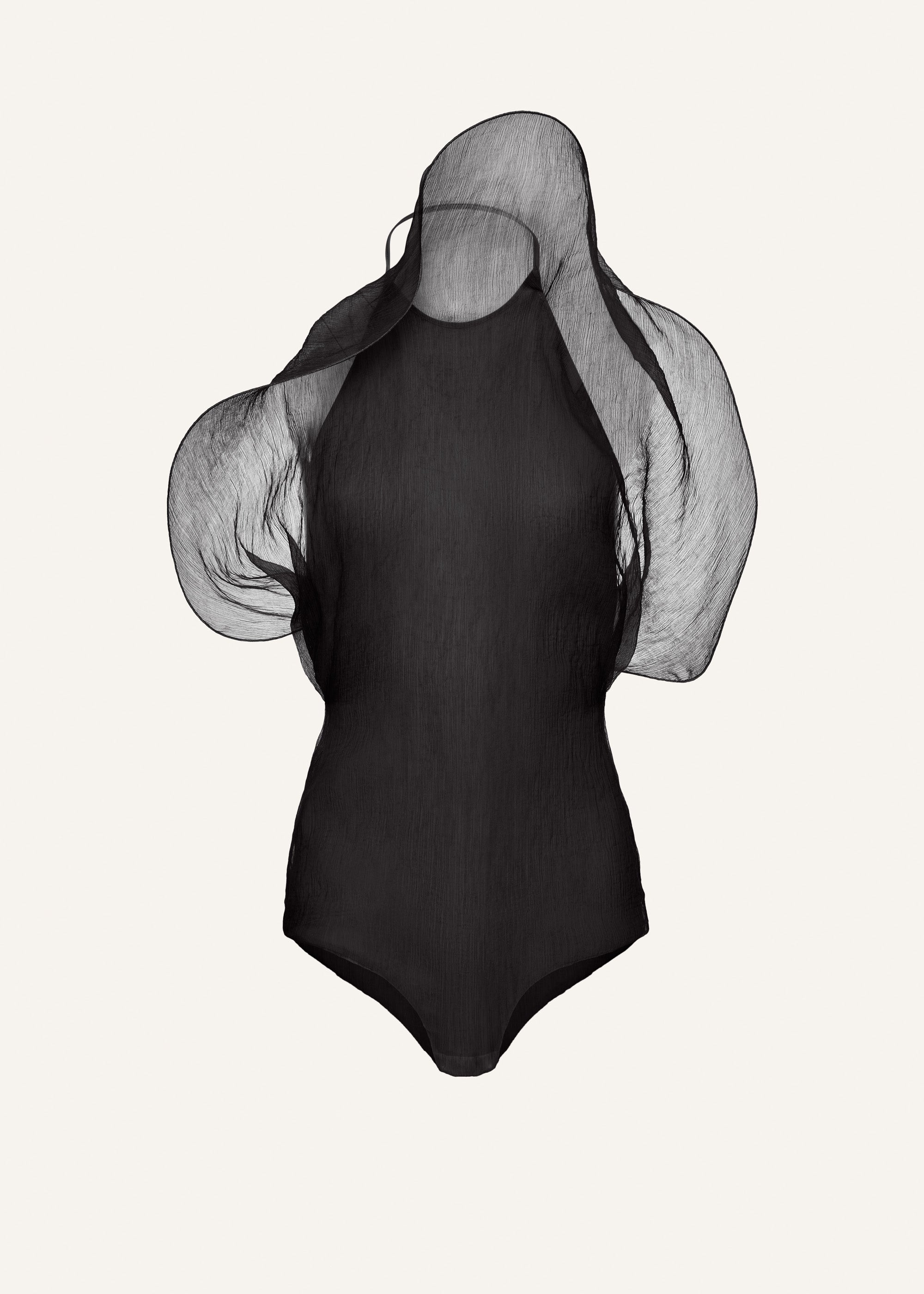 The semi-sheer silk organza is expertly draped, creating a fluid, ethereal silhouette. Soft, wavy ruffles cascade down the sides, adding a touch of artistry. The sculptural neckline and open-back design elevate its sensual allure. Available exclusively at magdabutrym.com and at the flagship boutique. Details ID: 979725 Shell 100% Silk. Lining (body) 92% Cupro 8% Elastane.