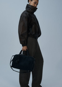 An oversized bomber jacket with a zip-front and a snap-collar closure. Details ID: 298725 Shell 100% Sheep Leather. Lining 100% Viscose. Sizing This piece fits true to size. We recommend you get your regular size. Model is 180 cm and is wearing a size 34.
