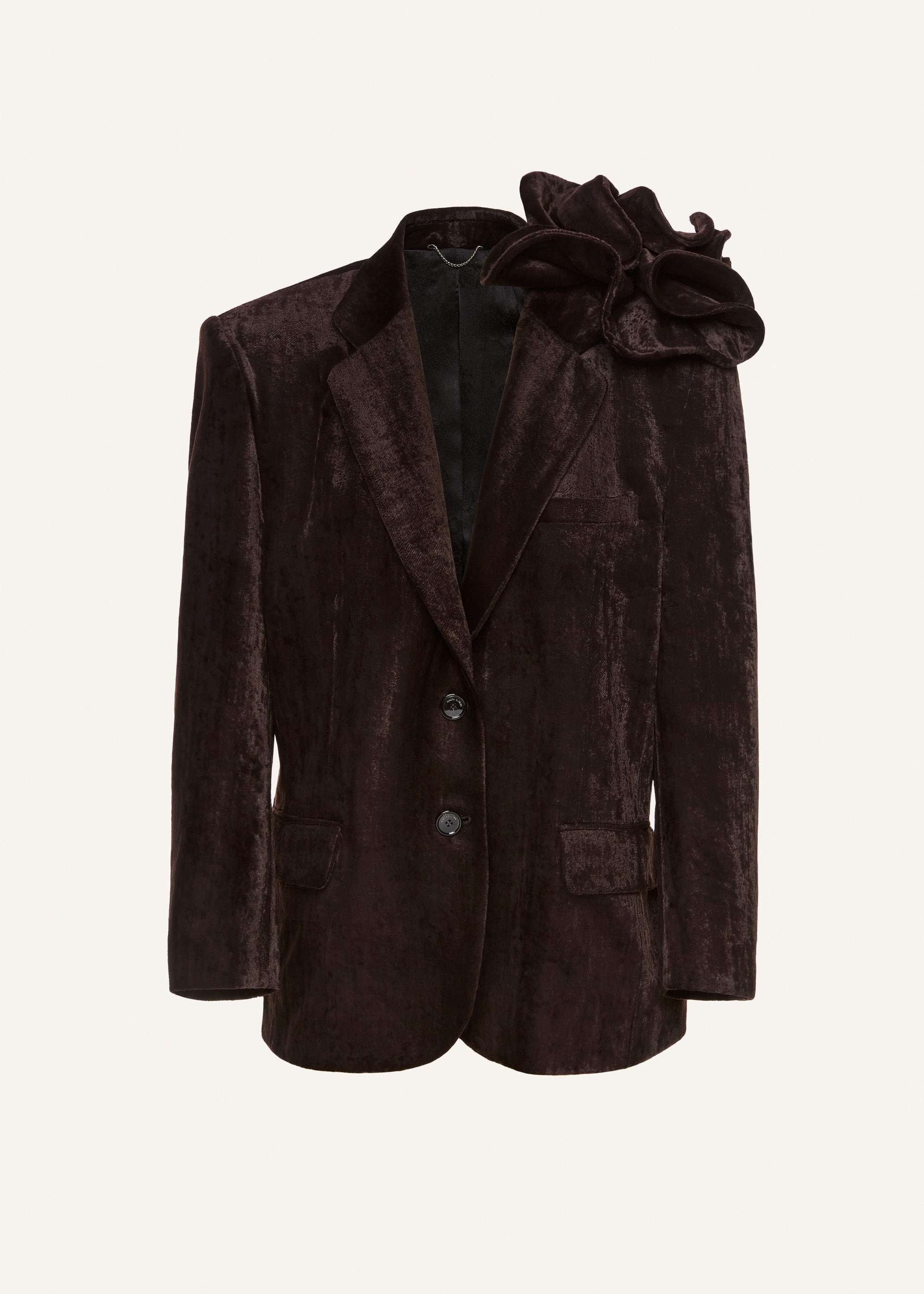 A tailored velvet blazer with strong shoulders and a soft, lustrous texture. Finished with classic notch lapels and flap pockets, the piece is adorned with Magda Butrym signature flower applique at the shoulder—fully detachable for versatile styling. Details ID: 105925 Shell 70% Acetate 30% Cotton. Lining 100% Silk. Sizing This piece fits true to size. We recommend you get your regular size. Model is 177 cm and is wearing a size 34.