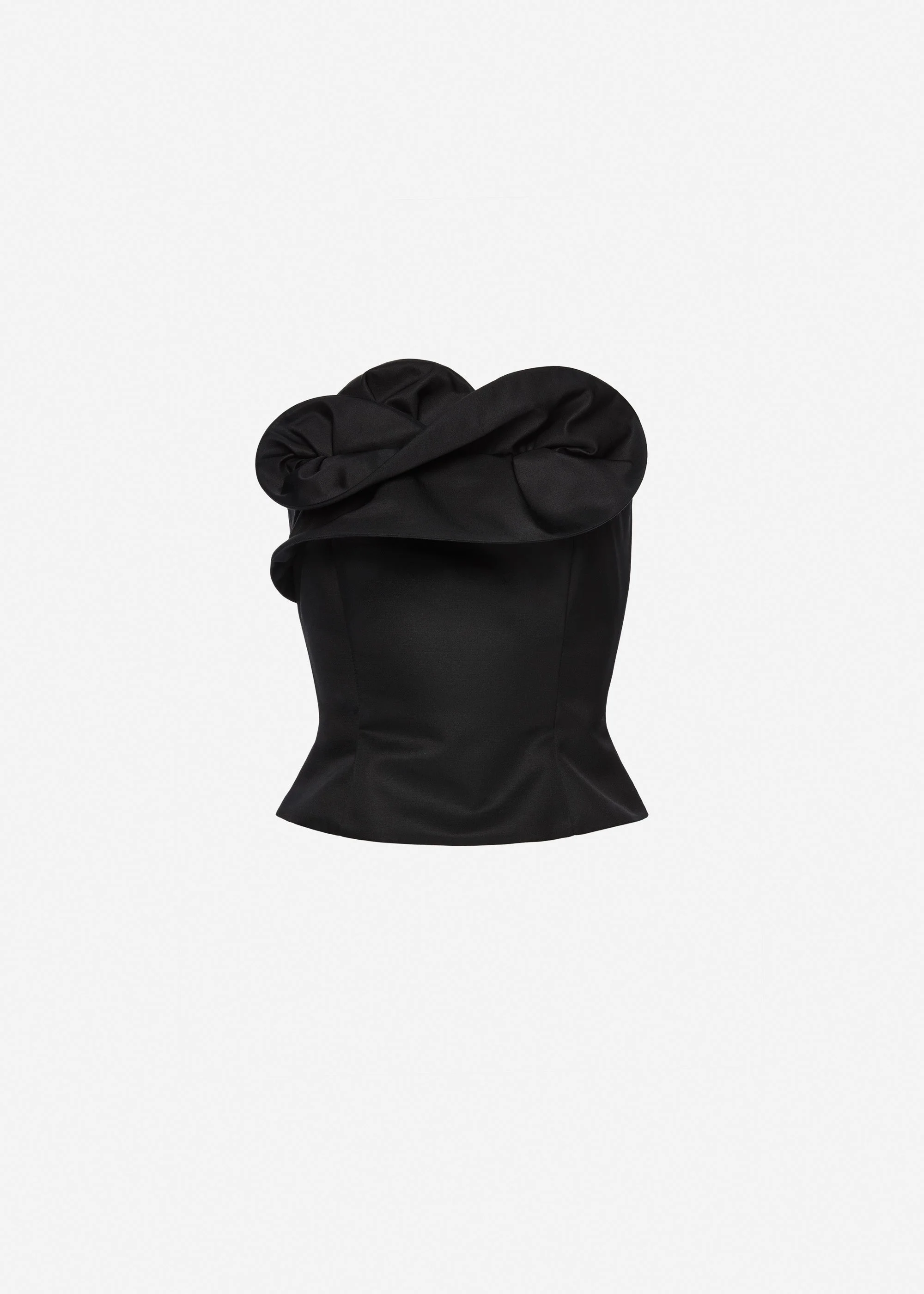 A structured corset crafted from a luxurious blend of wool and silk. Designed with internal boning along the seams for sculpted support and a fitted silhouette. The front is adorned with an intricate petal-like overlay shaped to resemble a blooming rose. Finished with a metal zip closure at the back and a full silk lining. Details ID: 163426 Shell 58% Virgin Wool 42% Silk Lining 100% Silk Sizing This piece has a slim fit. Model is wearing a size 34.