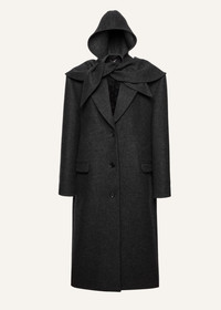 A classic wool coat that features structured shoulders, flap pockets and three-button closure. The standout detail is a detachable wool hood and scarf overlay that adds a Slavic-inspired flair. Details ID: 136925 Shell 99% Wool 1% Silk. Lining 100% Silk. Sizing This piece fits true to size. We recommend you get your regular size. Model is 177 cm and is wearing a size 34.