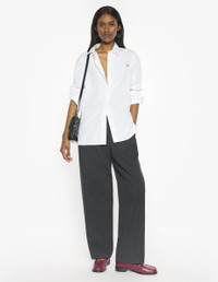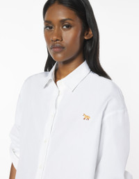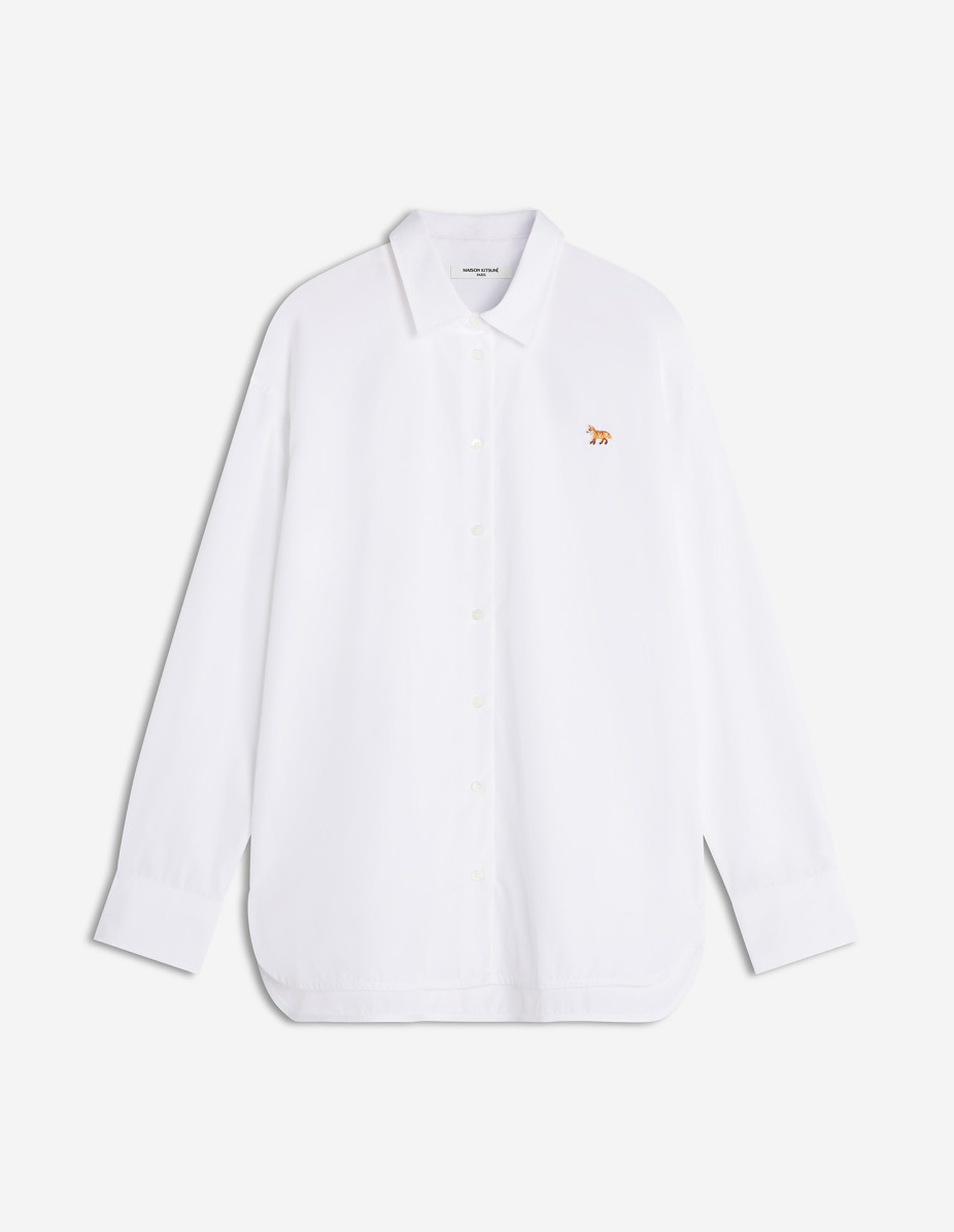 DETAILS Casual cotton poplin shirt. Casual fit with embroidered Baby Fox patch. - Casual shirt in plain cotton poplin - Casual fit - Classic collar - Maison Kitsune engraved button fastening - Baby Fox embroidered patch at the chest - Long sleeves ending in straight buttoned cuffs - Rounded hem - Plain back PW00401WC0026-P100 SIZE & CUT Cut: REGULAR Sizing: WOMEN The female model is 36 and is wearing size S MATERIAL 100% COTTON TRACEABILITY Made in Portugal