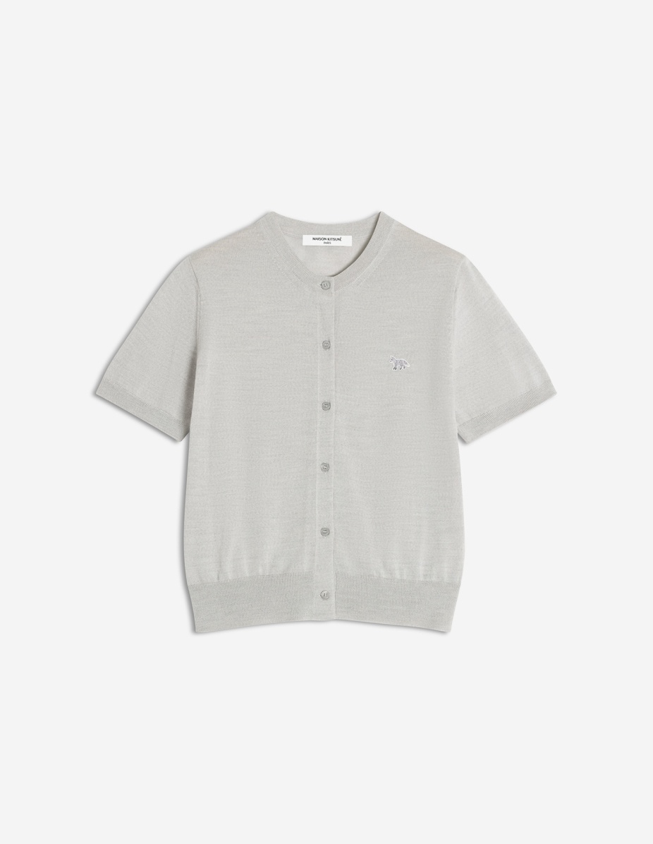 DETAILS Fine merino wool cardigan with short sleeves. Regular fit with embroidered Tonal Baby Fox patch. - Extra-fine merino wool cardigan - Regular fit - Maison Kitsune engraved button closure - Short sleeves - Rib finishing at the neckline, sleeves and hem - Lightweight knit - Tonal Baby Fox embroidered patch on chest OW00513KT1181-H120 SIZE & CUT Cut: REGULAR Sizing: WOMEN The female model is 5.7 and is wearing size S MATERIAL 100% WOOL TRACEABILITY Made in Portugal