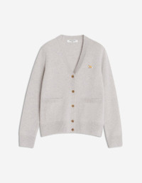 DETAILS Lambswool cardigan. Boxy fit with Baby Fox embroidered patch. - Plain lambswool cardigan - Boxy fit - V neck - Long sleeves - Maison Kitsune engraved button closure - Two front patch pockets - Ribbing at the neckline, cuffs and hem - Soft & hypoallergenic knit - Baby Fox embroidered patch on the chest PW00501KT1006-H120 SIZE & CUT Cut: BOXY Sizing: WOMEN The female model is 5.7 and is wearing size S MATERIAL 100% WOOL TRACEABILITY Made in Morocco