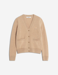 DETAILS Lambswool cardigan. Boxy fit with Baby Fox embroidered patch. - Plain lambswool cardigan - Boxy fit - Maison Kitsune engraved button closure - Long sleeves - Two front patch pockets - Ribbing at the neckline, cuffs and hem - Soft knit - Baby Fox embroidered patch on the chest PW00501KT1006-0054 SIZE & CUT Cut: BOXY Sizing: WOMEN The female model is 5.7 and is wearing size S MATERIAL 100% WOOL TRACEABILITY Made in Morocco