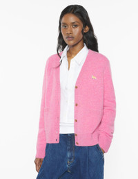 DETAILS Lambswool cardigan. Boxy fit with Baby Fox embroidered patch. - Plain lambswool cardigan - Boxy fit - V-neck - Maison Kitsune engraved button closure - Long sleeves - Two front patch pockets - Ribbing at the neckline, cuffs and hem - Soft & hypoallergenic knit - Baby Fox embrooidered patch on the chest PW00501KT1006-0327 SIZE & CUT Cut: BOXY Sizing: WOMEN The female model is 5.7 and is wearing size S MATERIAL 100% WOOL TRACEABILITY Made in Morocco
