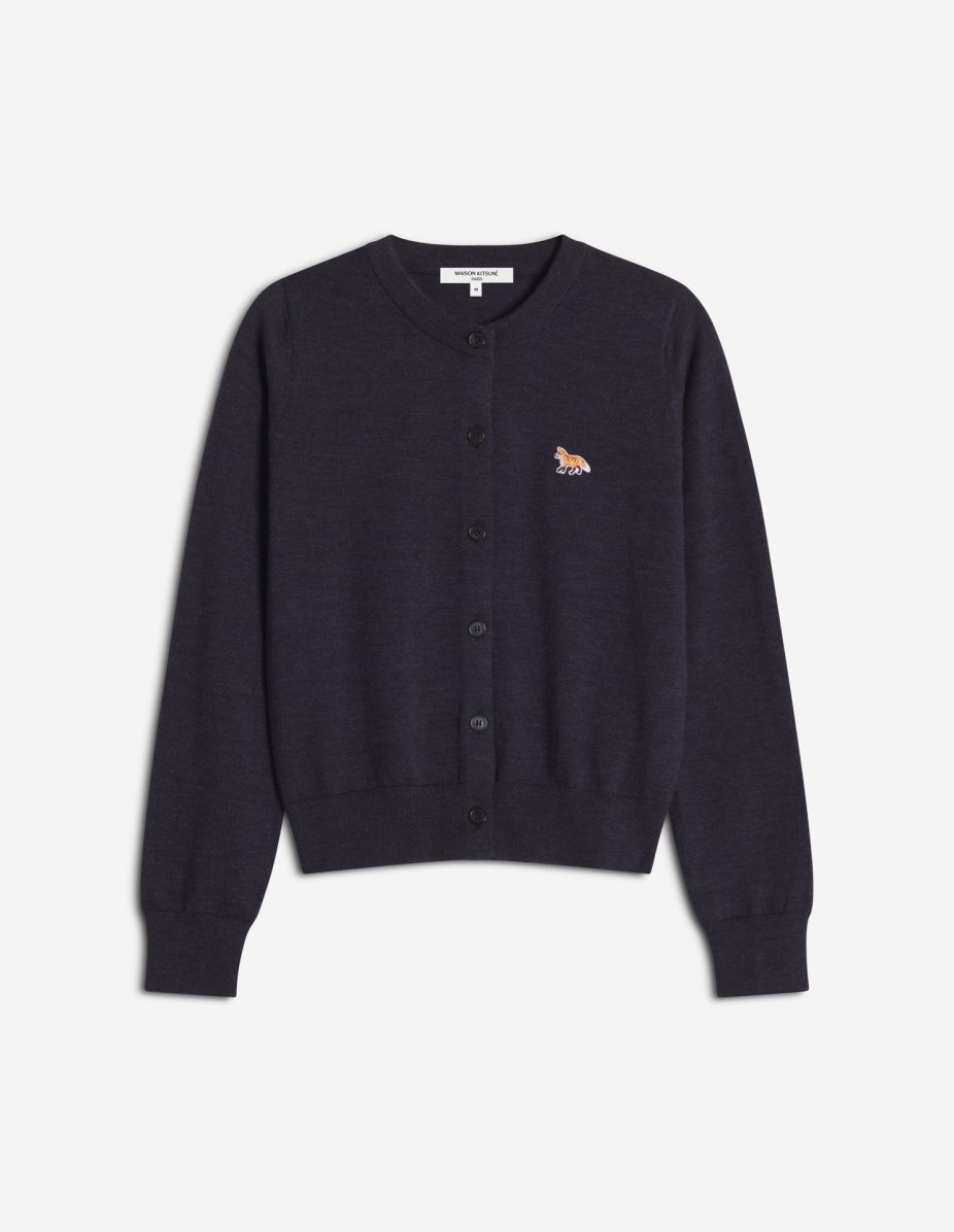 DETAILS Fine merino wool cardigan. Regular fit with embroidered Baby Fox patch. - Fine plain merino wool cardigan - Regular fit - Maison Kitsune engraved button closure - Long sleeves - Rib finishing at the neckline, cuffs and hem - Baby Fox embroidered patch on the chest PW00519KT1181-P480 SIZE & CUT Cut: REGULAR Sizing: WOMEN MATERIAL 100% WOOL TRACEABILITY Made in Morocco