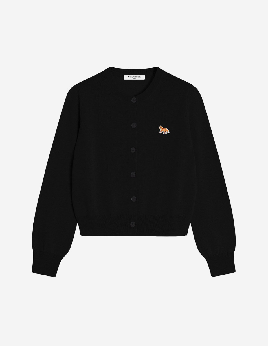 DETAILS Extra-fine merino wool cardigan. Regular fit with Baby Fox embroidered patch. - Extra fine plain merino wool cardigan - Regular fit - Crew neck - Long sleeves - Maison Kitsune engraved button closure - Rib finishing at the neckline, cuffs and hem - Baby Fox embroidered patch on the chest PW00502KT1181-P199 SIZE & CUT Cut: REGULAR Sizing: WOMEN The female model is 5.7 and is wearing size S MATERIAL 100% EXTRAFINE WOOL TRACEABILITY Made in Portugal