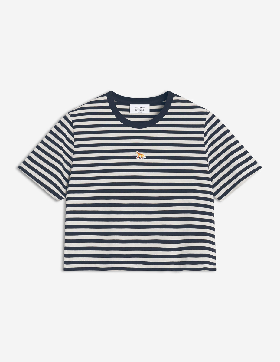 DETAILS Short-sleeve cotton jersey (180g) striped T-shirt. Cropped fit with Baby Fox embroidered patch. - Cotton jersey (180g) striped T-shirt - Organic cotton - Fitted cropped fit - Short sleeves - Crew neck with rib finishing - Baby Fox embroidered patch on the chest PW00118KJ7026-0392 SIZE & CUT Cut: CROPPED Sizing: WOMEN The female model is 5.7 and is wearing size S MATERIAL 100% COTTON TRACEABILITY Made in Portugal