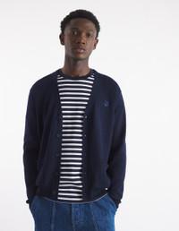 DETAILS Merino wool V-neck cardigan. Regular cut with Bold Fox Head patch embroidered at the chest. - Merino wool cardigan - Regular cut - V-neck - Ribbing at the cuffs, neckline, and waist - Button closure - Long sleeves - Two patch waist pockets - Embroidered Bold Fox Head patch at the chest - Plain back MM00509KT1036-P476 SIZE & CUT Cut: REGULAR Sizing: MEN MATERIAL 100% MERINO WOOL TRACEABILITY Made in Morocco