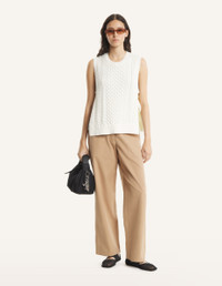 DETAILS Cable knit vest in cotton. Relaxed fit with Maison Kitsune Paris embroidery at the back neckline. - Cable knit vest in soft, thick cotton yarn - Relaxed fit - Crew neck - Sleeveless - Open sides with knotted tie closures - Rib finishing at the neckline, arms, and bottom - Maison Kitsune Paris embroidery at the back neckline QW00608KT1201-0383 SIZE & CUT Cut: RELAXED Sizing: WOMEN The female model is 5 tall and wears a size S MATERIAL 70% COTTON, 30% POLYAMIDE TRACEABILITY Made in China