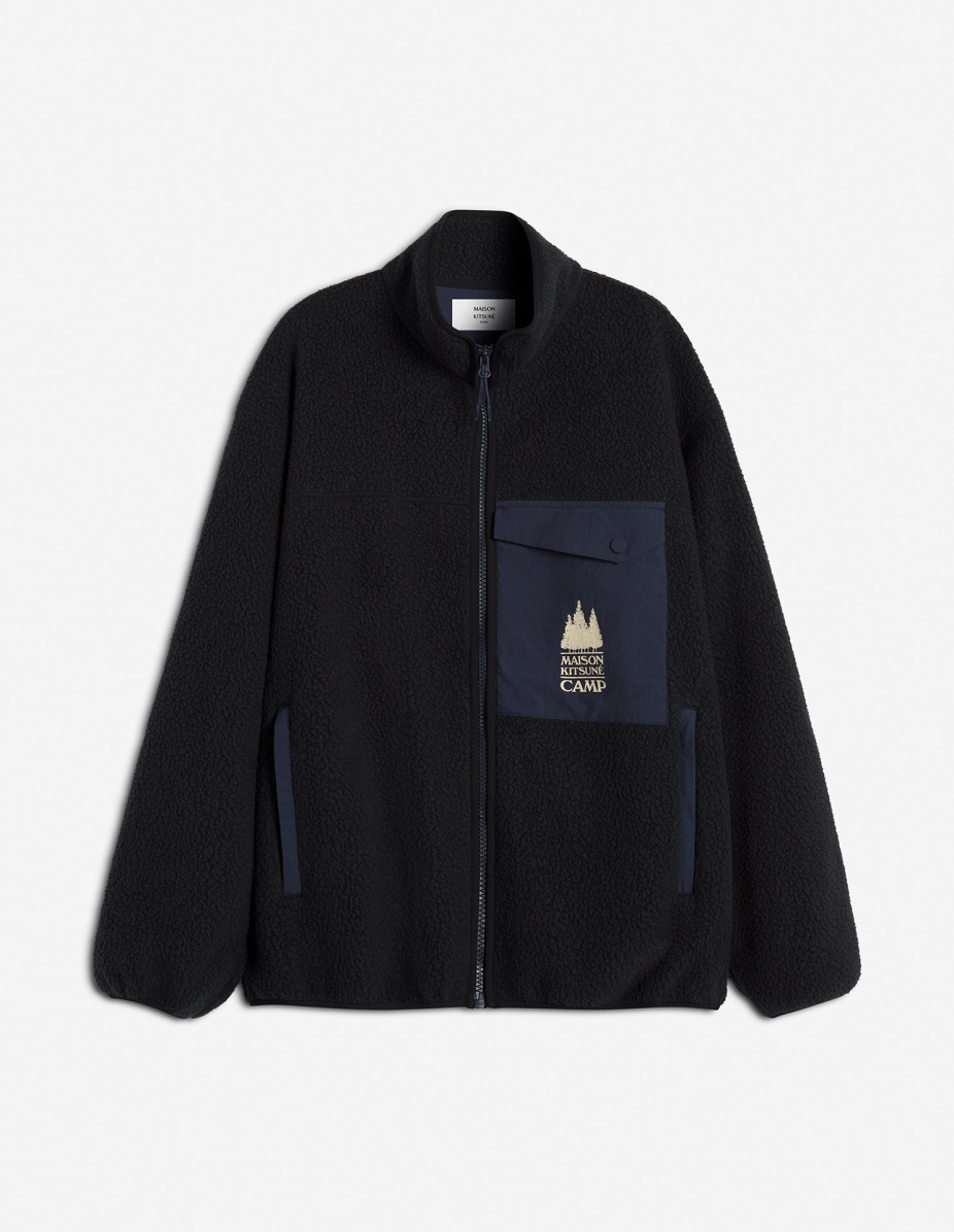 DETAILS Maison Kitsune Camp zip-up fleece jacket. - Fleece zipped jacket - Comfort fit - Nylon chest snap pocket - Two zipped side pockets - Zip fastening - Nylon patch on bottom sleeves - Maison Kitsune Camp signature printed on the chest PM02136WM2031-P199 SIZE & CUT Cut: COMFORT Sizing: MEN The male model is 6.1 and is wearing size M MATERIAL Main Material: 100% POLYESTER, Secondary material: 100% POLYAMIDE TRACEABILITY Made in China