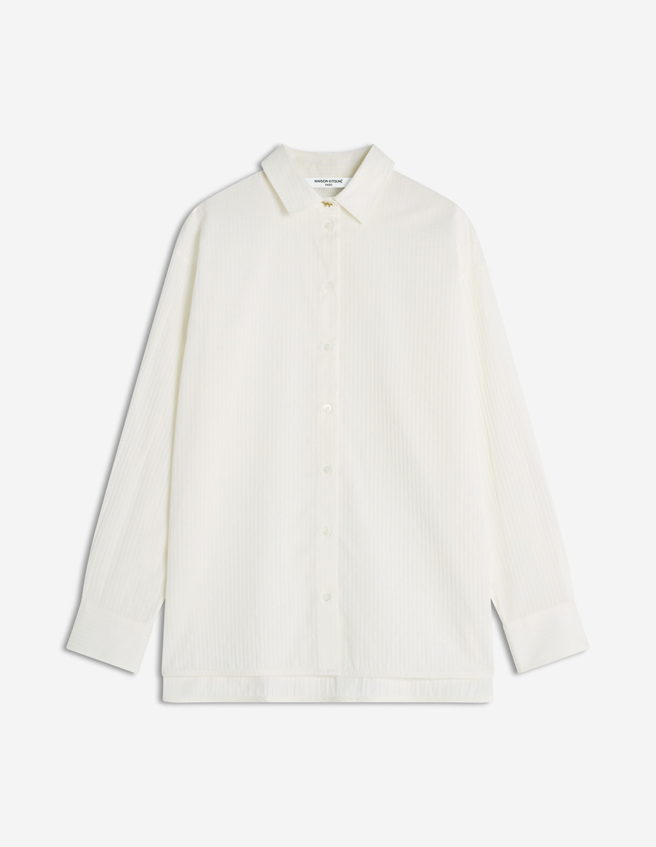 DETAILS Casual cotton-silk blend shirt with tonal soft textured stripes. Casual fit and gold Profile Fox button. - Casual shirt in a cotton-silk blend with tonal soft textured stripes - Casual fit - Long sleeves finished with a straight buttoned cuff - Classic collar - Gold Profile fox button at the collar - Engraved button closure PW00401WC5059-0305 SIZE & CUT Cut: REGULAR Sizing: WOMEN The female model is 5.7 and is wearing size 36 MATERIAL 90% COTTON, 10% SILK TRACEABILITY Made in Portugal