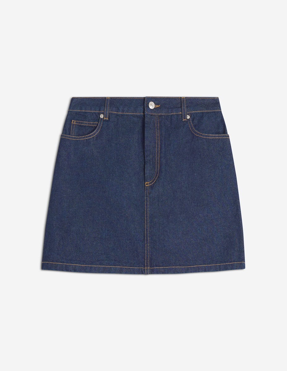 DETAILS Japanese denim mini skirt. Five-pocket design with Maison Kitsune Handwriting embossed jacron. - Japanese denim skirt - Mini length - Fixed waistband with belt loops - Engraved metal button closure and zip fly under placket - Five-pocket styling - Embossed leather jacron with Maison Kitsune Handwriting signature at the back PW01503WW0081-P470 SIZE & CUT Cut: MINI Sizing: WOMEN The female model is 5.7and is wearing size 26 MATERIAL Main Material: 100% COTTON, Pocket lining: 35% COTTON, 65% POLYESTER TRACEABILITY Made in Italy