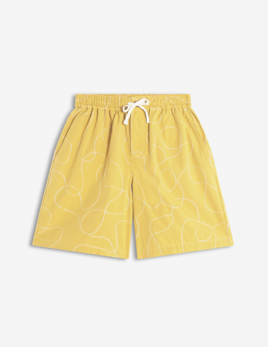 DETAILS Relaxed chambray shorts. Maison Kitsune Bali Handwriting embroidery. - Light chambray swim shorts - Casual fit - Elastic waistband with drawstring - Side pockets - All-over "Desa Design" embroidery - Maison Kitsune Handwriting embroidery SPOM141WC5043-0353 SIZE & CUT Sizing: MEN The male model is 10 and is wearing size M MATERIAL 100% COTTON TRACEABILITY Made in Portugal