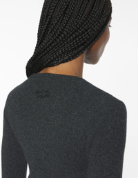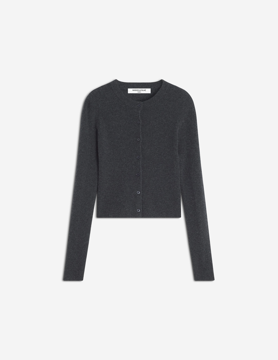 DETAILS 100% cashmere fine rib cardigan. Fitted, cropped fit with Maison Kitsune Handwriting signature embroidered at the back. - Pure cashmere fine rib cardigan - Fitted cropped fit - Maison Kitsune engraved button closure - Long sleeves - Rib finishing at the neckline, cuffs and waist - Tonal Maison Kitsune Handwriting signature embroidered at the back PW00511KT1172-P180 SIZE & CUT Cut: FITTED Sizing: WOMEN The female model is 5.7 and is wearing size S MATERIAL 100% CASHMERE TRACEABILITY Made in China