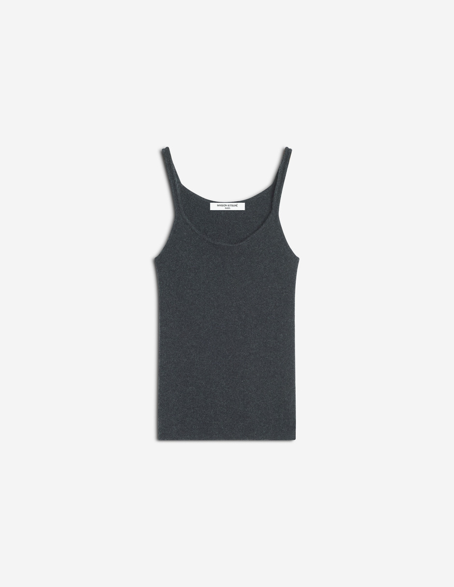DETAILS 100% cashmere fine rib tank top. Fitted fit with Maison Kitsune Handwriting signature at the back. - Pure cashmere fine rib tank top - Fitted fit - Scoop neckline - Thin straps - Tonal Maison Kitsune Handwriting signature embroidered on the back PW00615KT1172-P180 SIZE & CUT Cut: FITTED Sizing: WOMEN The female model is 5.7 and is wearing size S MATERIAL 100% CASHMERE TRACEABILITY Made in China