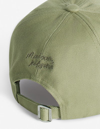 DETAILS Six-panel cotton twill cap, tonal Fox Head patch, embroidered Maison Kitsune Handwriting signature. - Cotton twill cap - Six-panel cap - Curved brim - Tone-on-tone Fox Head patch at front - Adjustable metal buckle at back engraved with Maison Kitsune and Profile fox - Maison Kitsune Handwriting signature embroidered at the back MM06104WW0096-P131 SIZE & CUT Sizing: UNISEX MATERIAL 100% COTTON TRACEABILITY Made in China