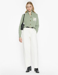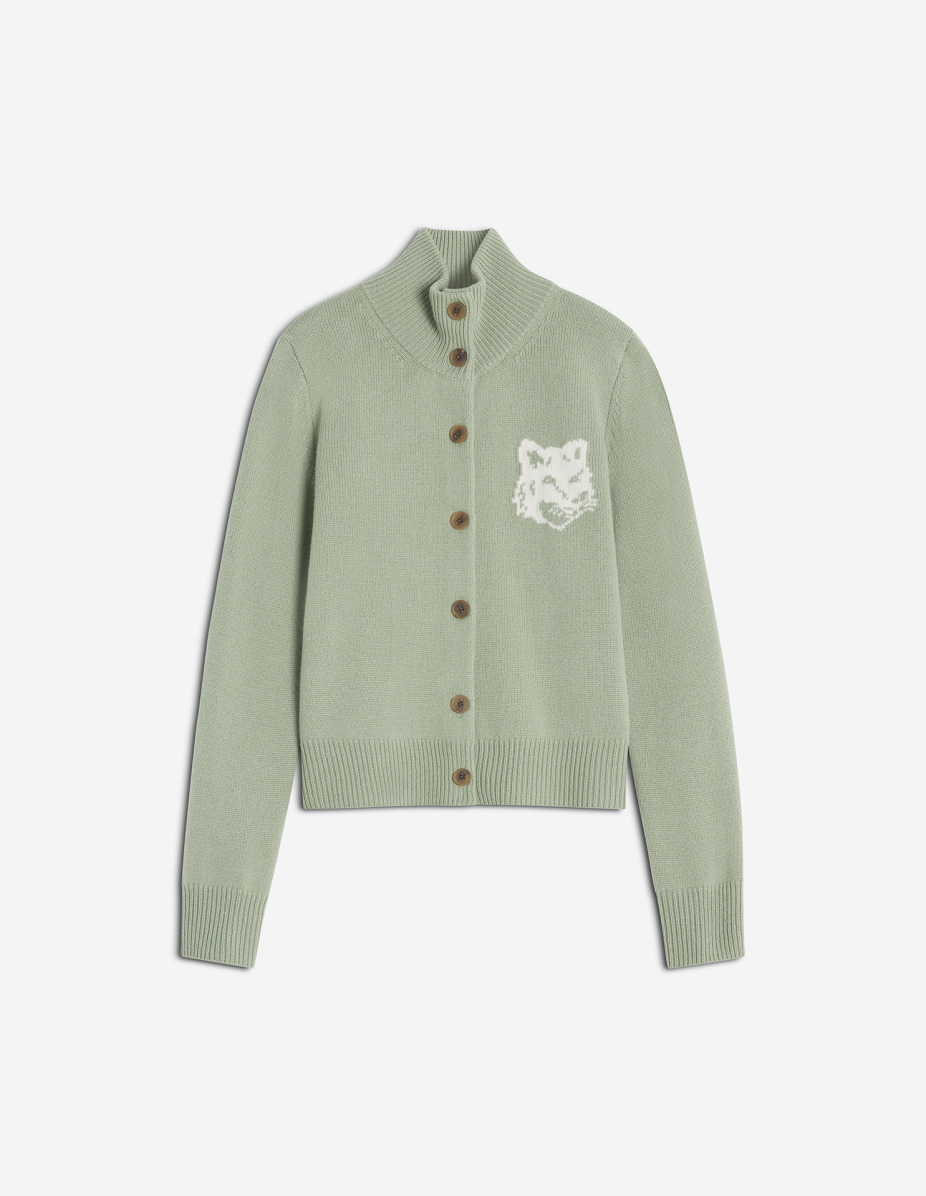 DETAILS Merino wool cardigan with high neck. Regular fit with Fox Head intarsia on the chest. - Merino wool cardigan with stand-up collar - Regular fit - Maison Kitsune engraved button closure - Long sleeves - Rib finishing at collar, cuffs and hem - Fox Head intarsia on the chest NW00509KM0329-0396 SIZE & CUT Cut: REGULAR Sizing: WOMEN The female model is 5.7 and is wearing size S MATERIAL 100% WOOL TRACEABILITY Made in China