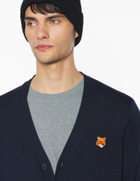 DETAILS Extra-fine merino wool V-neck cardigan. Regular fit with embroidered Fox Head patch. - Extra-fine merino wool cardigan - Regular fit - V neck - Long sleeves - Maison Kitsune engraved button closure - Ribbing at the neckline, cuffs and waist - Fine gauge knit - Fox Head embroidered patch on the chest PM00501KT1181-0413 SIZE & CUT Cut: REGULAR Sizing: MEN The male model is 6.1 and is wearing size M MATERIAL 100% WOOL TRACEABILITY Made in Morocco