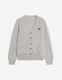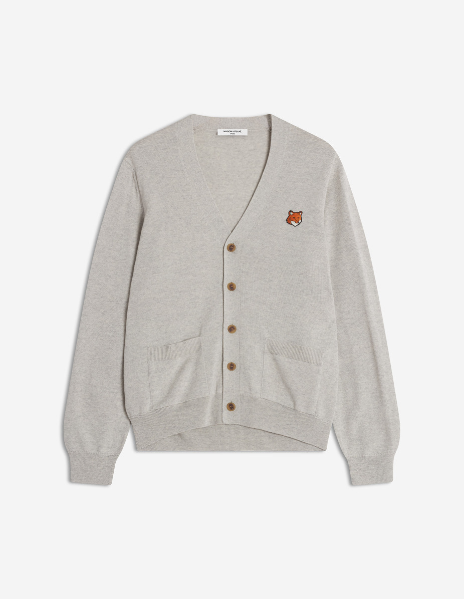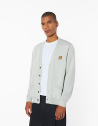 DETAILS Extra-fine merino wool V-neck cardigan. Regular fit with embroidered Fox Head patch. - Extra-fine merino wool cardigan - Regular fit - V neck - Long sleeves - Maison Kitsune engraved button closure - Ribbing at the neckline, cuffs and waist - Fine gauge knit - Fox Head embroidered patch on the chest PM00501KT1181-H120 SIZE & CUT Cut: REGULAR Sizing: MEN MATERIAL 100% WOOL TRACEABILITY Made in Morocco